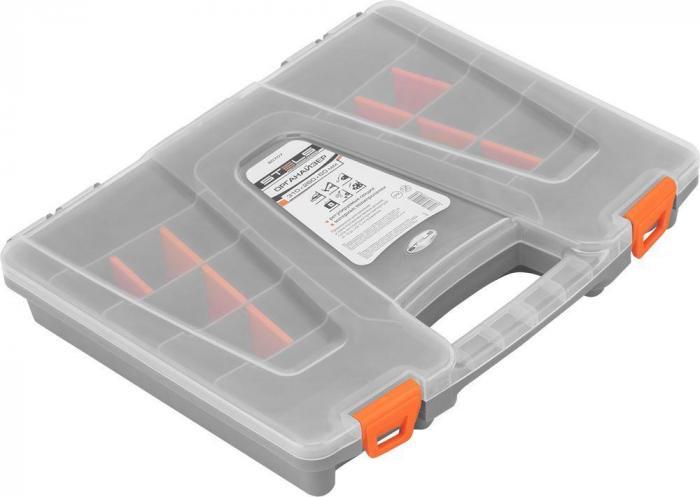 Органайзер из пластика Stels 90707 размером 310 х 250 х 50 мм позволяет обустроить практичное место хранения мелких деталей. Также его удобно брать с собой на выездные работы. Органайзер помогает поддерживать порядок в мастерской и предотвращает потерю деталей. Преимущества Полипропиленовый корпус гарантирует защиту содержимого от влаги и пыли.Размер секций можно регулировать, это обеспечивает возможность хранения различных деталей.Органайзер оснащен ручкой и защелками для удобства и безопасности транспортировки.