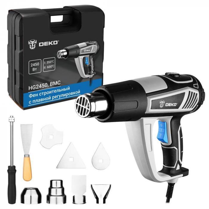- Строительный фен DEKO HG2450 в кейсе предназначен для широкого спектра задач: формования/сварки изделий из ПВХ, полистирола, акрилового пластика и плексигласа, сушки красок, заливочных масс и клеев, удаления герметиков, лакокрасочных/ковровых покрытий и обоев, усадки термоусадочных шлангов, размораживания, размягчения клеящих веществ и удаления наклеек, запрессовки упаковочной пленки, изготовления поделок (например, тиснение).